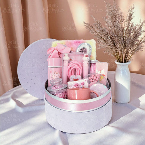 Brighten someone’s day with our Trendy Lifestyle & Treats Hamper, a playful and practical gift box filled with essentials, sweet treats, and self-care items. It includes a fuzzy notebook, temperature bottle, skipping rope, coffee mug, compact mirror, paper soap bottle, hair bow band, stationery set, marshmallow candy, nail extension, and chocolate. Perfect for birthdays, teenage or young adult gifting, festive surprises, school or college gifts, self-care treats, or fun lifestyle hampers, this collection adds joy, convenience, and little indulgences to daily life.