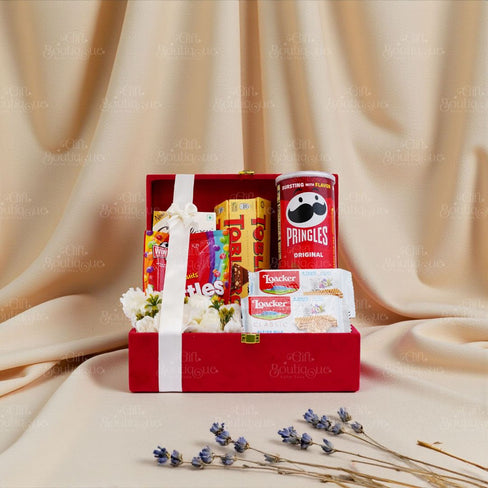 A vibrant assortment of crunchy snacks and indulgent chocolates curated to bring instant joy. Perfectly balanced between sweet and savoury, this hamper is ideal for sharing, celebrating, or enjoying a delicious break anytime. It includes Skittles Fruits, Loacker Classic Wafers, Pringles, Toblerone Milk Chocolate, Galaxy Fruit & Nut Chocolate, and Galaxy Cookie Crumble Chocolate. Perfect for birthdays, festive gifting, movie nights, return gifts, casual celebrations, or a fun surprise for chocolate and snack lovers of all ages.