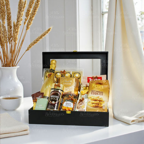 A luxurious chocolate and gourmet indulgence hamper curated with premium chocolates, coffee, and fine wine, perfect for those who enjoy refined tastes and elegant treats. It includes Lindor Assorted Chocolates, Loacker Cappuccino, Nescafe Gold, Foxes White Chocolate, Rocher T24, Mackays Fruit Orange, Ginger Extract, Ritbite Choco Delight, Godiva Dark Chocolate, Vocca Kunafa Coconut Milk Chocolate, and Giacobazzi Wine. Ideal for corporate gifting, festive celebrations, anniversaries, chocolate connoisseurs, coffee lovers, or anyone who appreciates premium indulgence with a touch of sophistication.