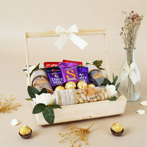 Indulge in our Luxury Nuts & Chocolate Hamper, thoughtfully curated to delight the senses with a perfect balance of indulgence and wholesome treats. It includes cashews, almonds, pistachios, seedless kishmish, KitKat, Dairy Milk Bubbly, Dairy Milk Roast Almond, Tiffany Break, and Ferrero Rocher. Perfect for festive celebrations, birthdays, corporate gifting, or sharing a luxurious treat with loved ones, this elegant hamper offers a memorable and indulgent gifting experience.
